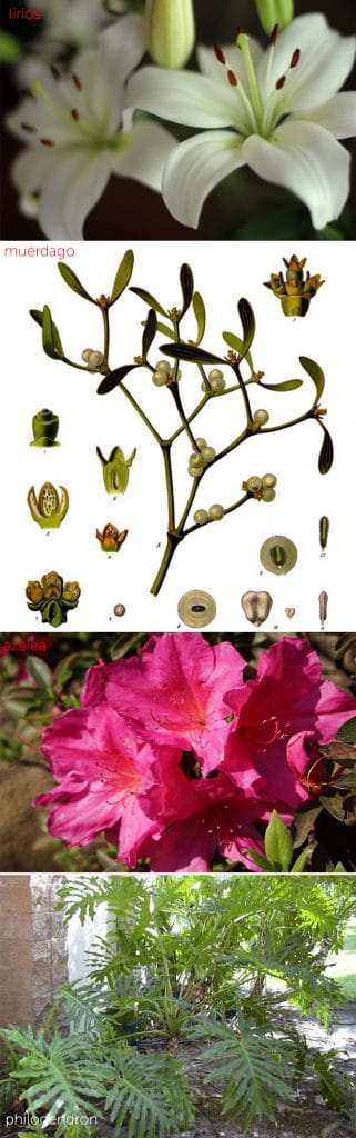 Otras plantas tóxicas para ellos que deberías evitar en un hogar con mascotas son las azaléas (Rhododendron L.), el muérdago (Viscum album), y el filodendro (Philodendron).